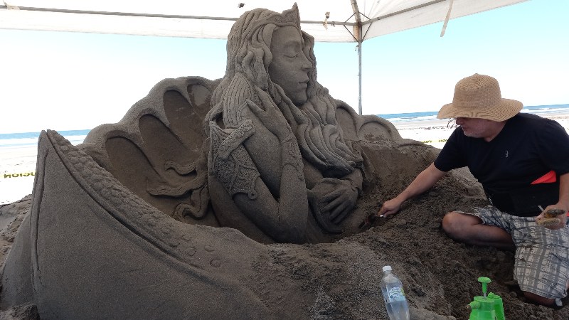"La escultura en arena tiene ciertos requerimientos y a veces cuesta mucho trabajo, pero para ser la primera vez está quedando bien y eso habla bien de la organización. No me puedo quejar, mucha mariscada, estoy muy contento", dijo Calixto Mejía, reconocido escultor internacional.