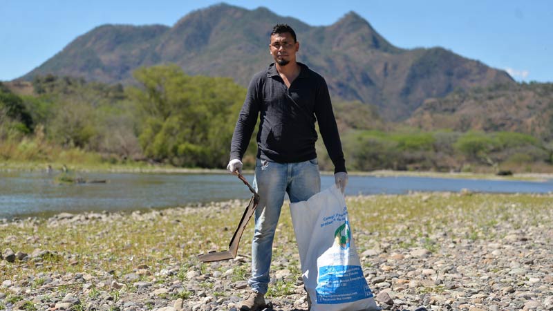 Joselito se agacha y recoge del lecho del Lempa un pedazo de metal oxidado. Da dos pasos y saca de entre las piedras una bolsa plástica mohosa. Avanza un poco más y levanta una botella plástica. Continúa y halla un tapón. Así, con cierta frustración, el auxiliar de fontanería participa en la jornada de limpieza del Lempa.