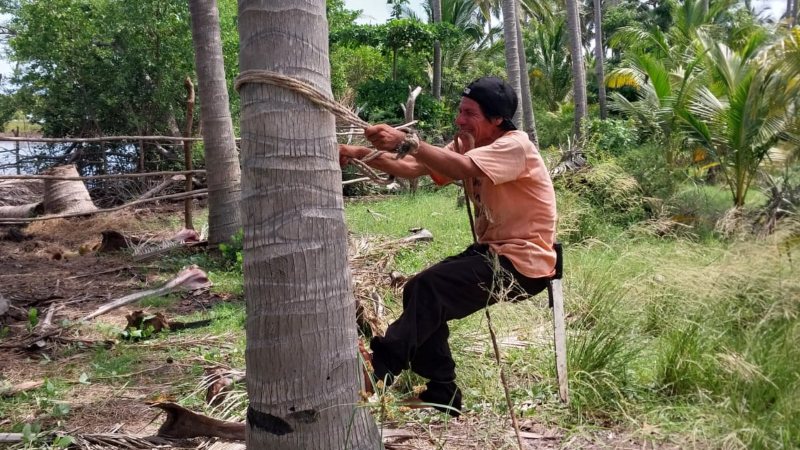 Comenzó a desempeñar el “oficio” de cortador de cocos cuando apenas tenía 13 años. Tres décadas después, se ha convertido en todo un experto, al punto que a diario sube veinte palmeras para cortar cincuenta cocos, en cada una.