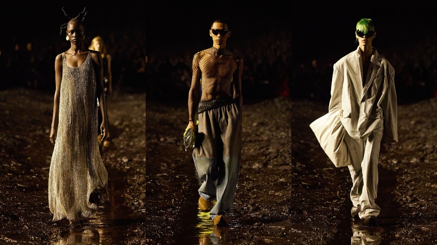 Demna y Balenciaga dicen que esta pasarela se inspiró en mantener los pies en la tierra y vivir en tu verdad. Lo que justificaría, la piscina de lodo que sirvió como pasarela para que las modelos y los espectadores vieran la moda bajo la óptica del mundo real.
